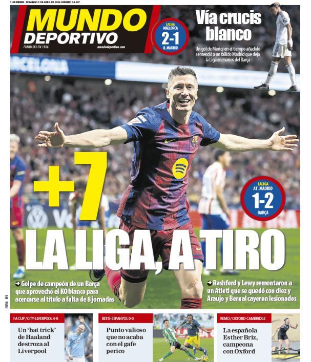 El Mundo Deportivo hace hincapié en primera página en el gol tardío de Lewandowski, gracias al cual el Barcelona consiguió vencer anoche al Atlético de Madrid.
