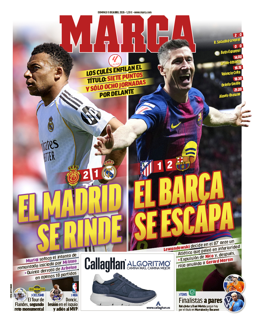 Marca destaca en su portada la derrota del Real Madrid en Son Moix y la victoria del Barcelona ante el Atlético de Madrid.