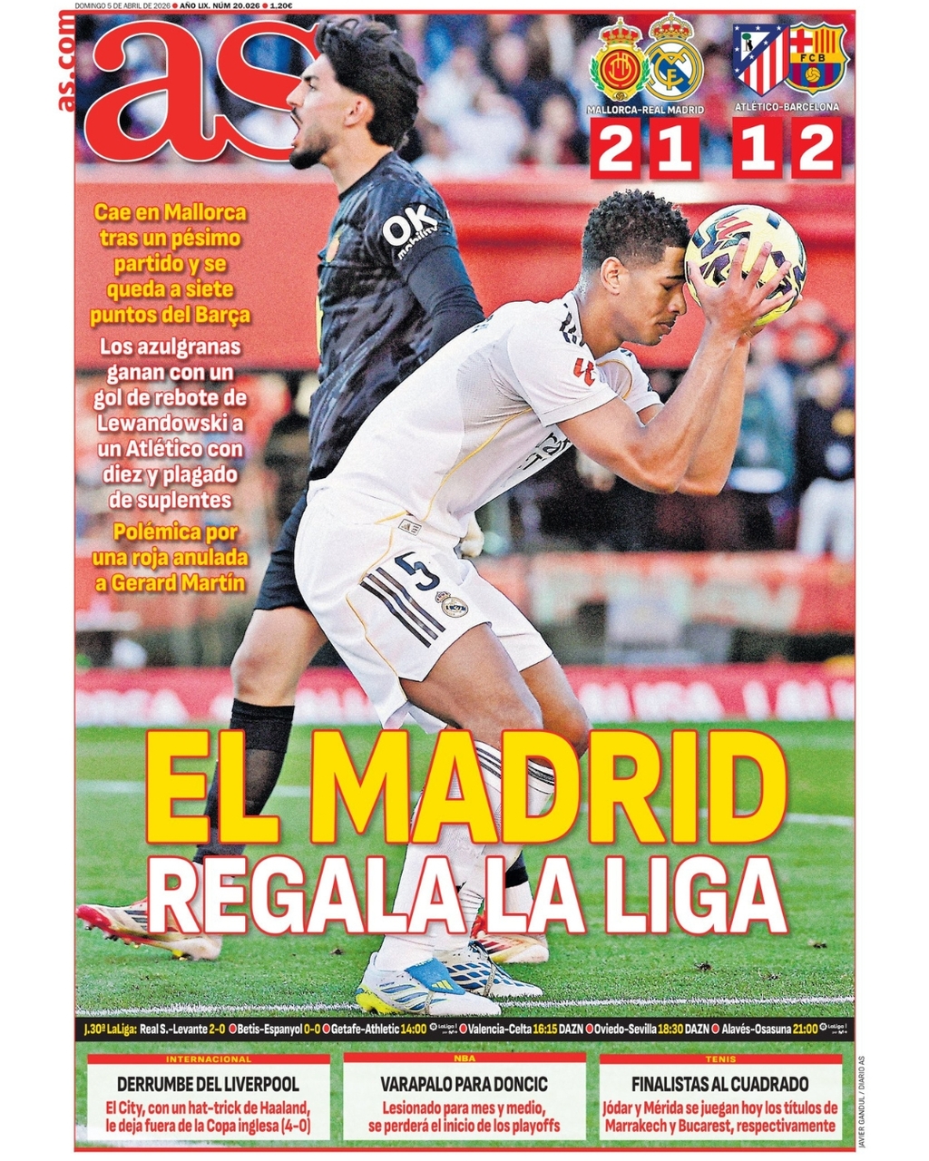 Por parte del AS, el diario saca en primera plana a Jude Bellingham, como imagen de la frustración del Real Madrid en la derrota ante el Mallorca.