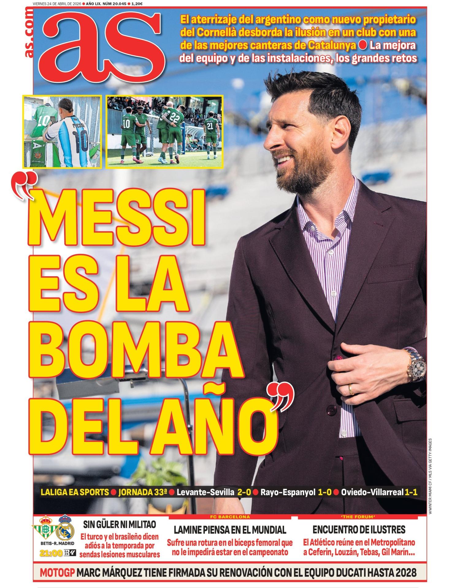 Por parte del AS, el diario saca en primera plana a Lionel Messi, quien se ha convertido en una revolución en Barcelona al haberse hecho con la compra del Cornellá, uno de los clubes con mejor cantera de toda Cataluña.