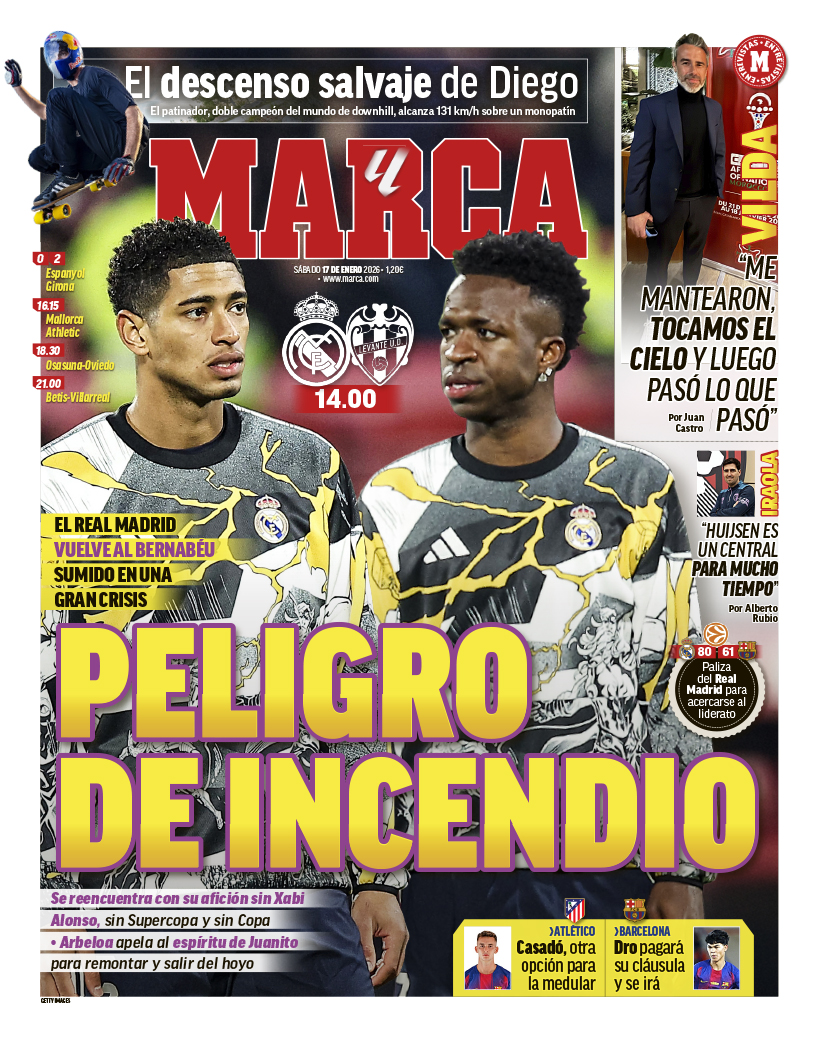 El diario Marca destaca en su portada el "peligro de incendio" que supondrá la vuelta al Santiago Bernabéu del Real Madrid tras la derrota en la Copa del Rey ante el Albacete y que supuso la eliminación. Asimismo, la gran crisis en la que está sumida el equipo blanco verá la reacción de los aficionados.