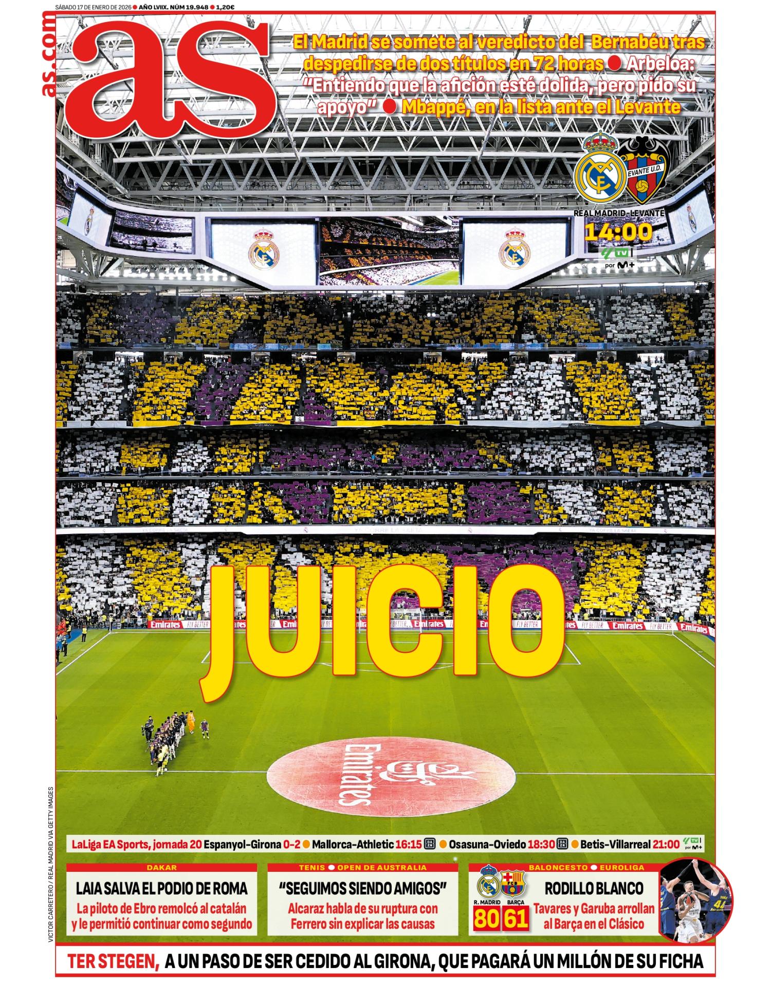 Desde el AS sacan en primera plana el "juicio" del Real Madrid en el Estadio Santiago Bernabéu tras la derrota en la Copa del Rey frente al Albacete, así como la caída en la final de la Supercopa de España contra el Barcelona.