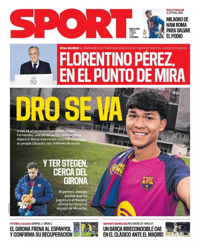 Sport destaca en la portada la salida de Dro, que ejecutará su cláusula de salida para salir del club culé. También sobre el Real Madrid, ya que "Florentino Pérez, en el punto de mira" es el título que saca el medio.