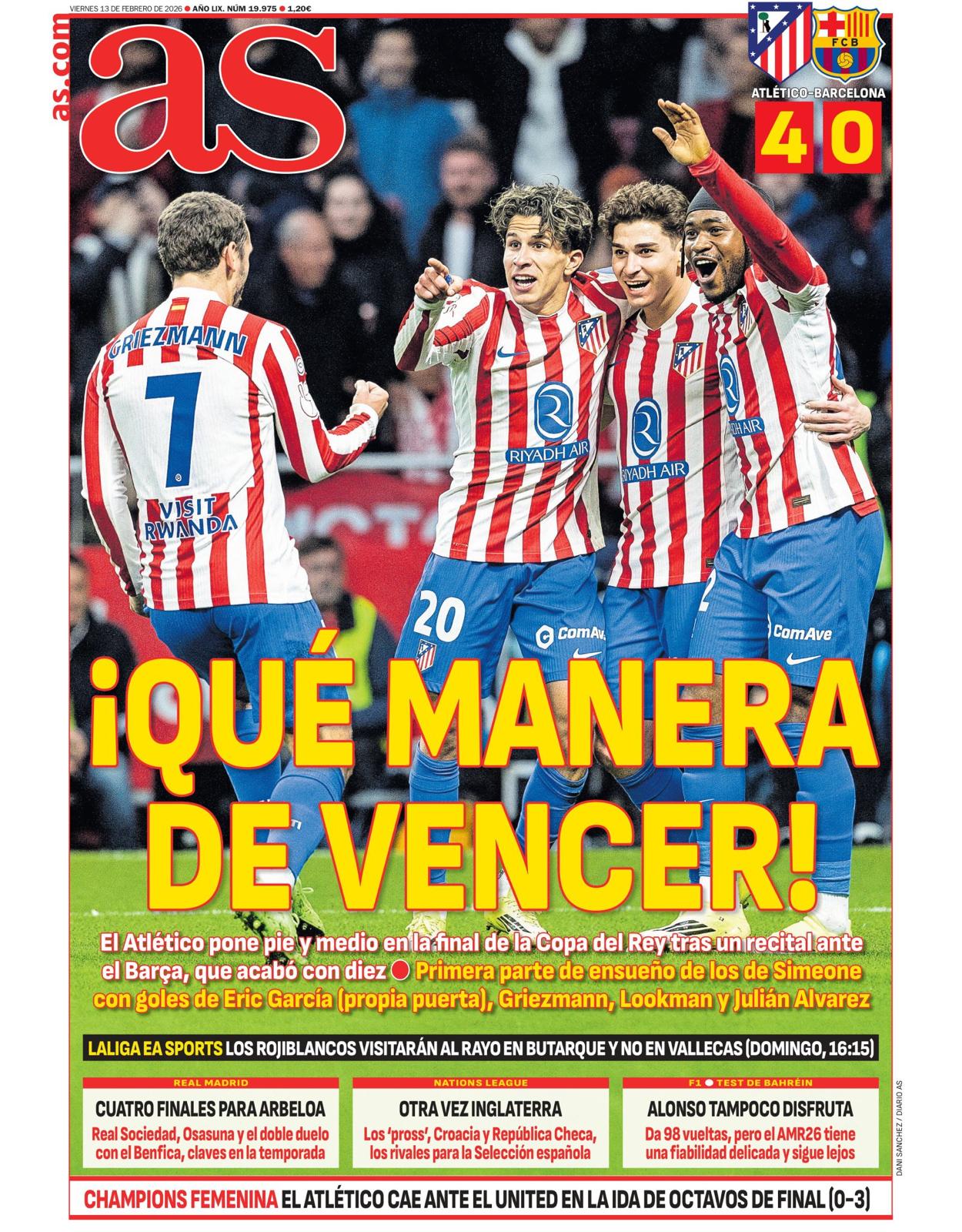 El Diario As titula ´¡Qué manera de vencer!´ haciendo referencia a la goleada del Atlético de Madrid al FC Barcelona en la Copa del Rey. En la parte inferior, afirman que los partidos ante la Real, Osasuna y ante el Benfica por partida doble, serán cuatro finales para Arbeloa a corto plazo.