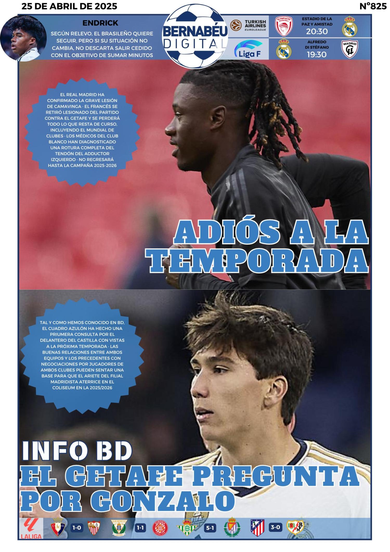 En nuestra portada de este viernes 25 de abril, en Bernabéu Digital hemos decidido abrir con la lesión de Eduardo Camavinga, que se pierde lo que resta de temporada; y con la INFO BD sobre el interés del Getafe en Gonzalo García, delantero del Real Madrid Castilla.
