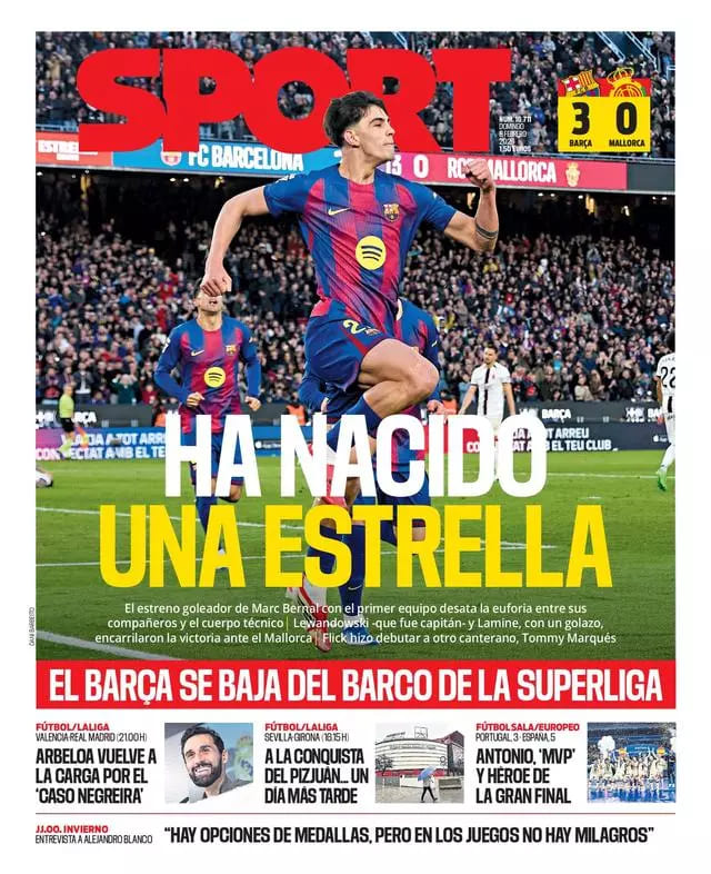 Por parte de Sport, su portada destaca la victoria ante el Mallorca por 3-0 con un gol de Marc Bernal desde el banquillo.