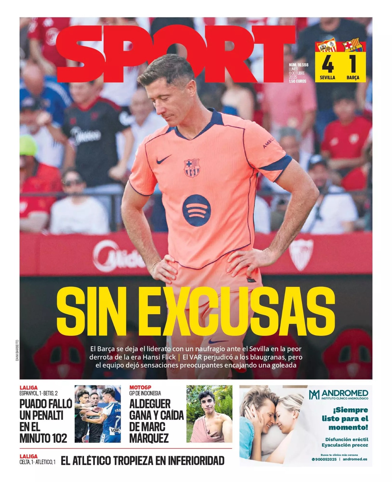 La derrota del Barcelona por 4-1 ante el Sevilla y la consecuente recuperación del liderato por parte del Real Madrid, protagonista en la prensa deportiva.