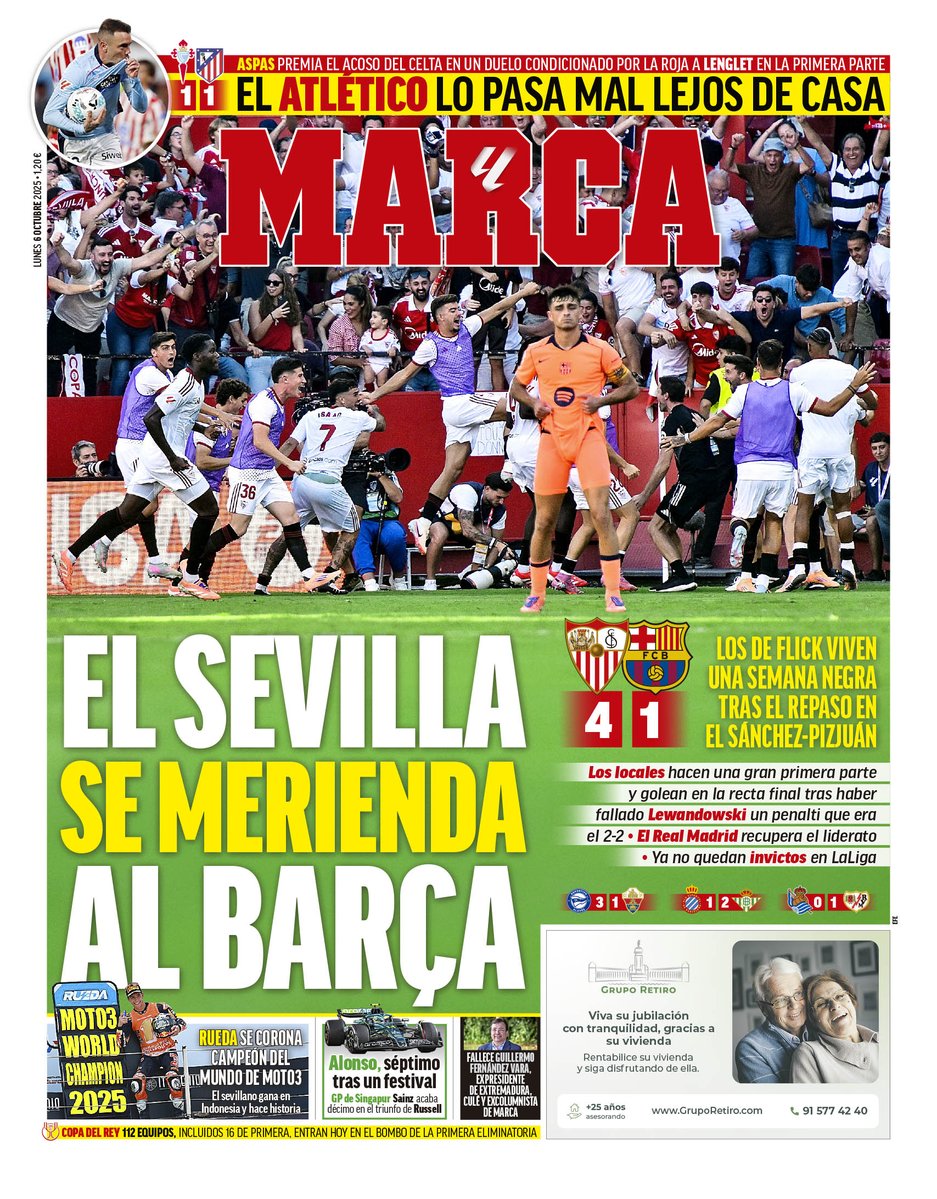 La paliza del Sevilla al Barcelona y el liderato del Real Madrid, en las portadas de la prensa deportiva