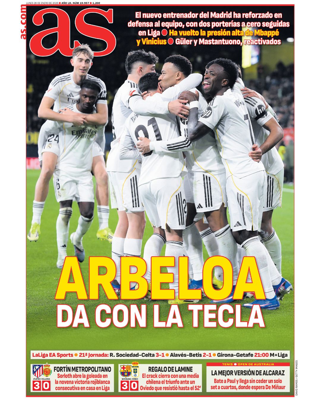 Por parte del AS, desde el diario sacan en primera plana que "Arbeloa da con la tecla" en el Real Madrid tras la victoria del club blanco en Villarreal gracias a los dos goles de Kylian Mbappé y a dos grandes jugadas de Vinicius Jr.