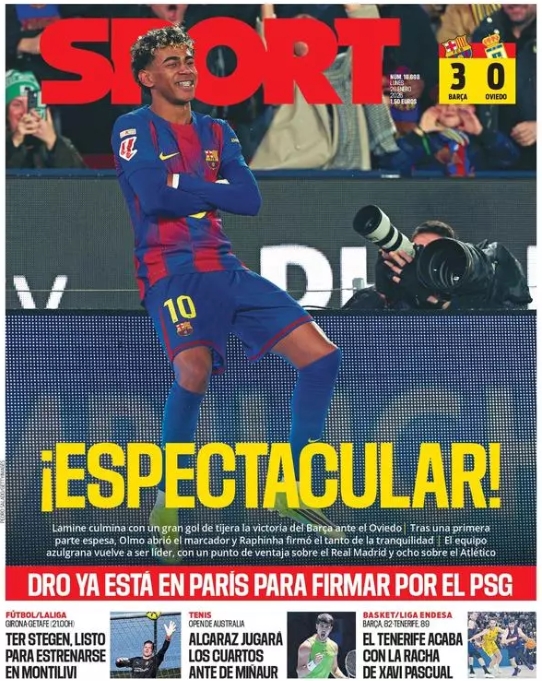 El Sport saca en portada la victoria del Barcelona en la Liga EA Sports contra el Real Oviedo en un encuentro que deja a los culés en lo más alto del campeonato liguero nuevamente.