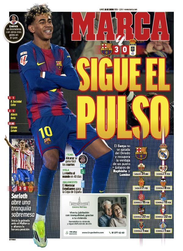 El diario Marca destaca el triunfo del FC Barcelona ante el Real Oviedo hablando abiertamente de que se mantiene el pulso por LaLiga. Los azulgranas son líderes con un punto de diferencia.