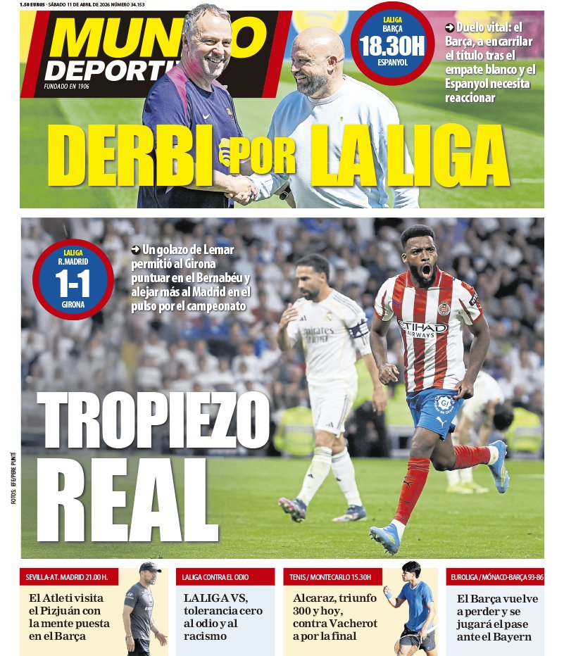 El Mundo Deportivo hace hincapié en primera página en el tropiezo que sufrió ayer el Real Madrid y que podría significar decir adiós definitivamente a la posibilidad de ganar la liga, ya que la única opcion de los blancos es que el Barça pierda el derbi contra el Espanyol además de ganar 'el Clásico'.