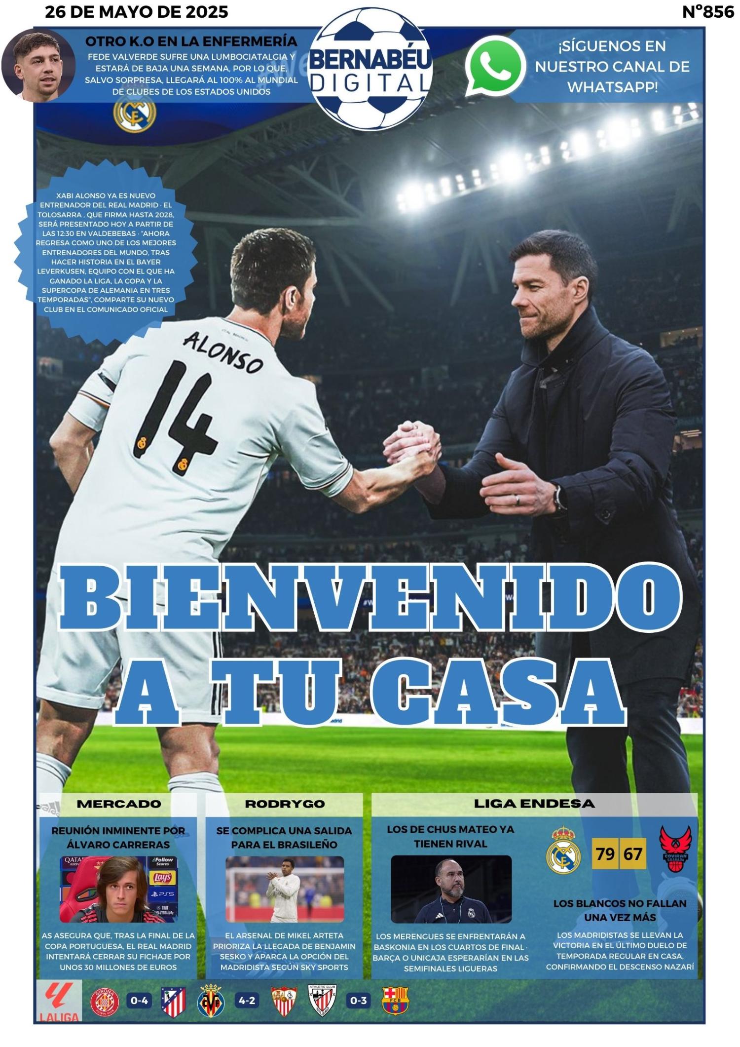 En nuestra portada del lunes 26 de mayo de 2025, en Bernabéu Digital hemos decidido abrir con la llegada ya oficial de Xabi Alonso al banquillo del Real Madrid.