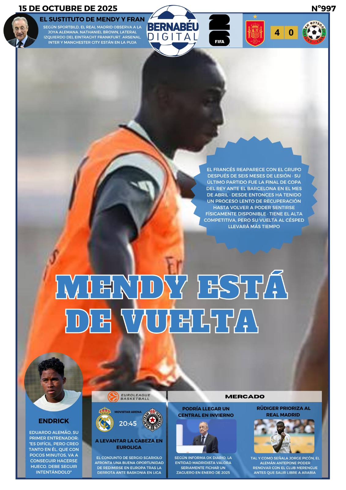 En nuestra portada del miércoles 15 de octubre de 2025, en Bernabéu Digital hemos decidido abrir con el regreso de Ferland Mendy a los entrenamientos del Real Madrid.