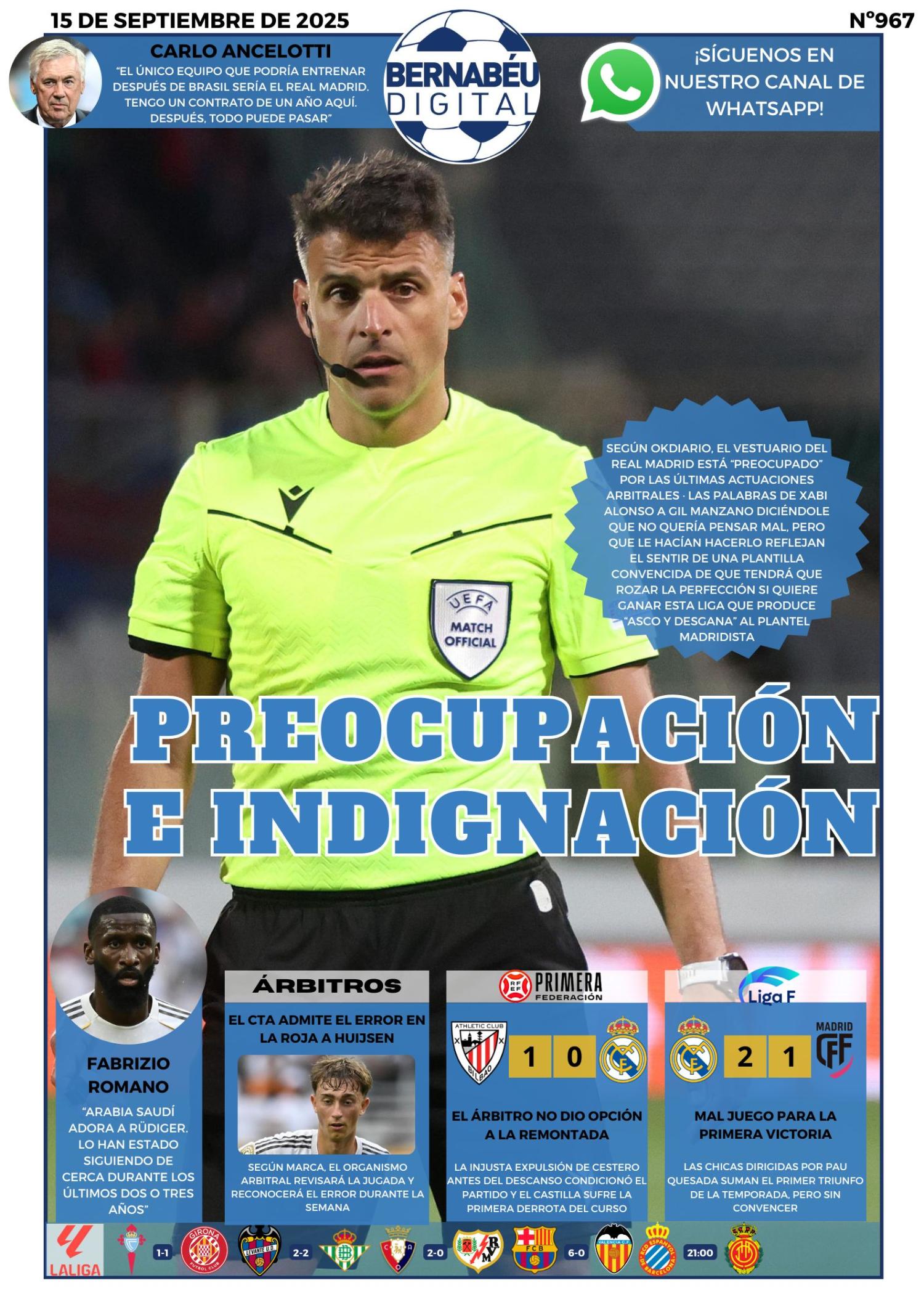 En nuestra portada del lunes 15 de septiembre de 2025, en Bernabéu Digital hemos decidido abrir con la "preocupación e indignación" del Real Madrid con las últimas actuaciones arbitrales.