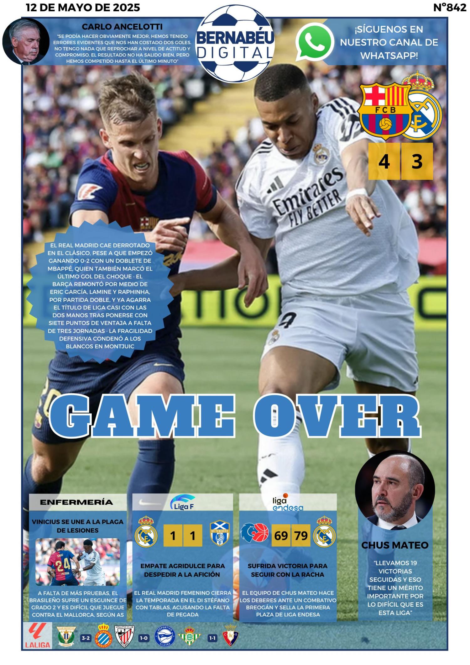 En nuestra portada del lunes 12 de mayo de 2025, en Bernabéu Digital hemos decidido abrir con el FC Barcelona 4-3 Real Madrid. Asimismo, nos hacemos eco de las declaraciones de Carlo Ancelotti, la victoria en baloncesto y el empate del femenino.