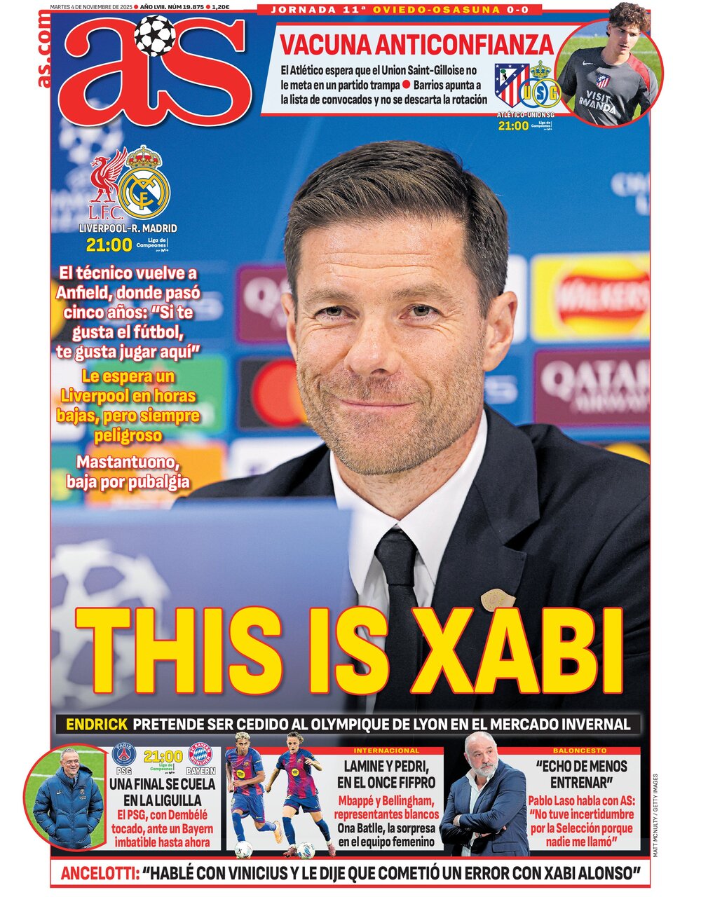La portada de AS destaca el regreso de Xabi Alonso a Anfield