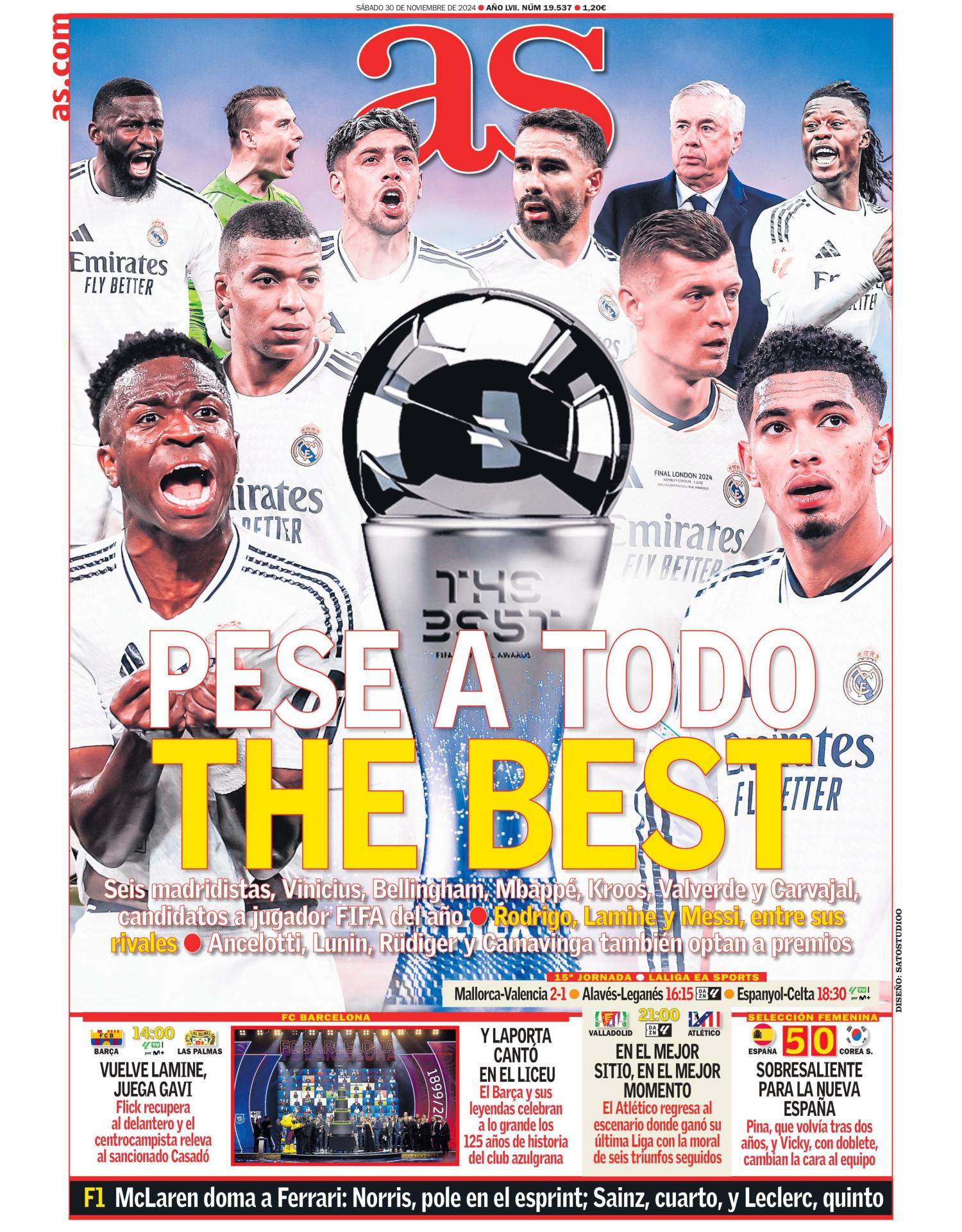Este sábado 30 de noviembre de 2024, el diario as destaca los nominados del Real Madrid a los premios The Best: Rüdiger, Lunin, Valverde, Carvajal, Ancelotti, Camavinga, Mbappé, Kroos, Vinicius y Bellingham. Unas nominaciones que llegan en medio de las críticas al equipo por la última derrota en Liverpool.