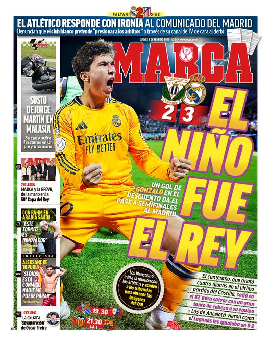 En su portada de este jueves, el diario Marca abre con la clasificación del Real Madrid para las semifinales de la Copa del Rey.