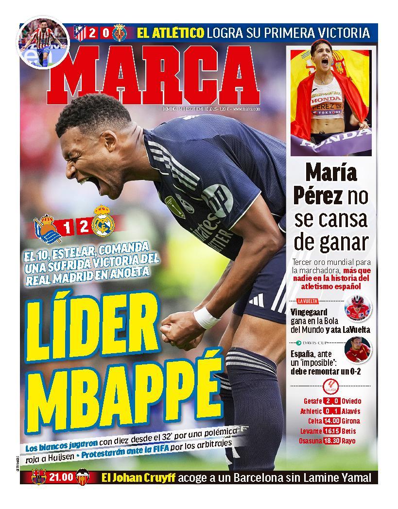 La portada de Marca abre con la victoria del Real Madrid en San Sebastián, poniendo el foco en la figura de Kylian Mbappé.