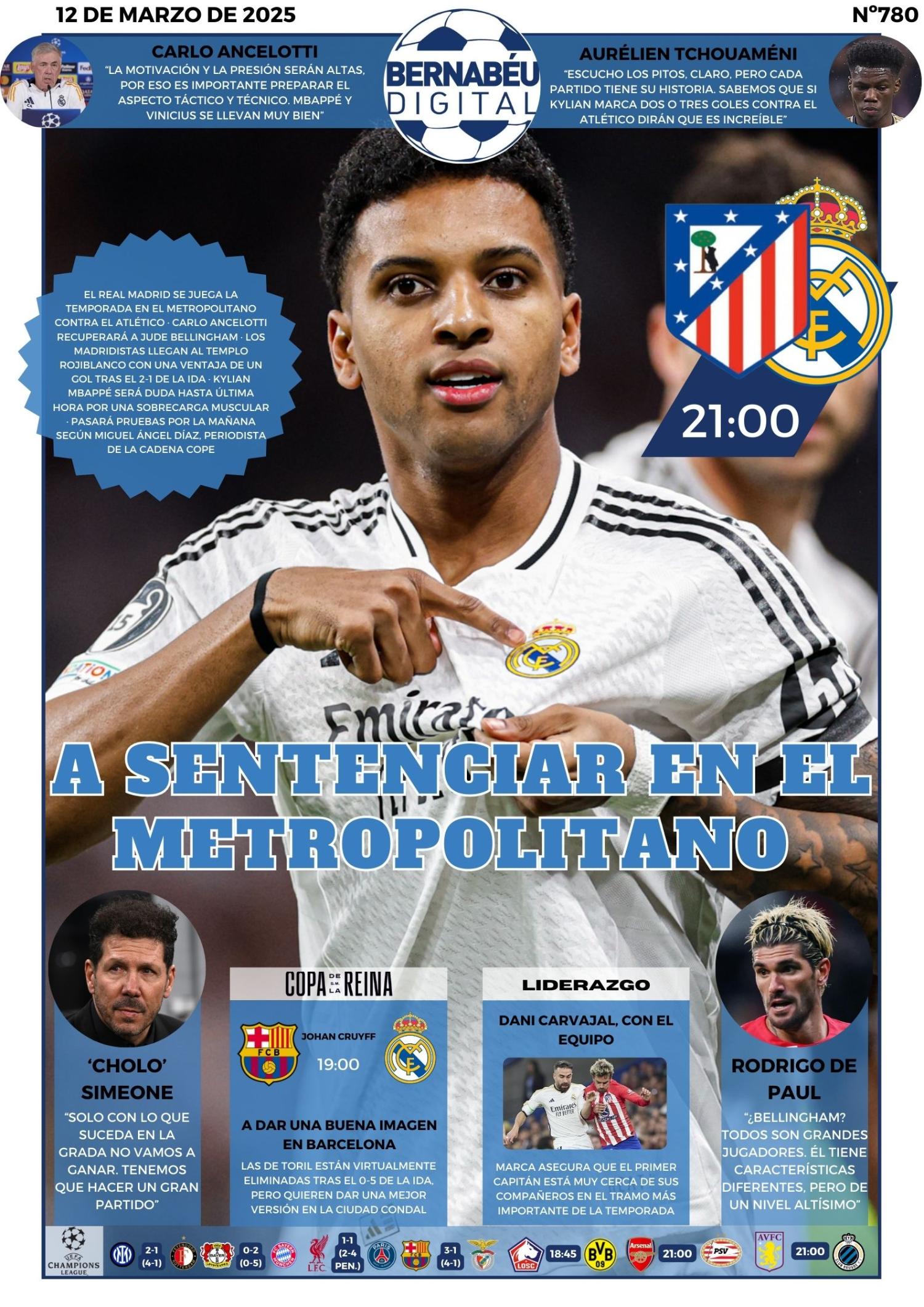 En la portada de Bernabéu Digital destacamos la previa del Atlético - Real Madrid en el Metropolitano. Colchoneros y madridistas se juegan el pase a los cuartos de final de la UEFA Champions League. La gran incógnita, la de Kylian Mbappé, que pasará pruebas por la mañana para determinar el alcance de sus molestias.