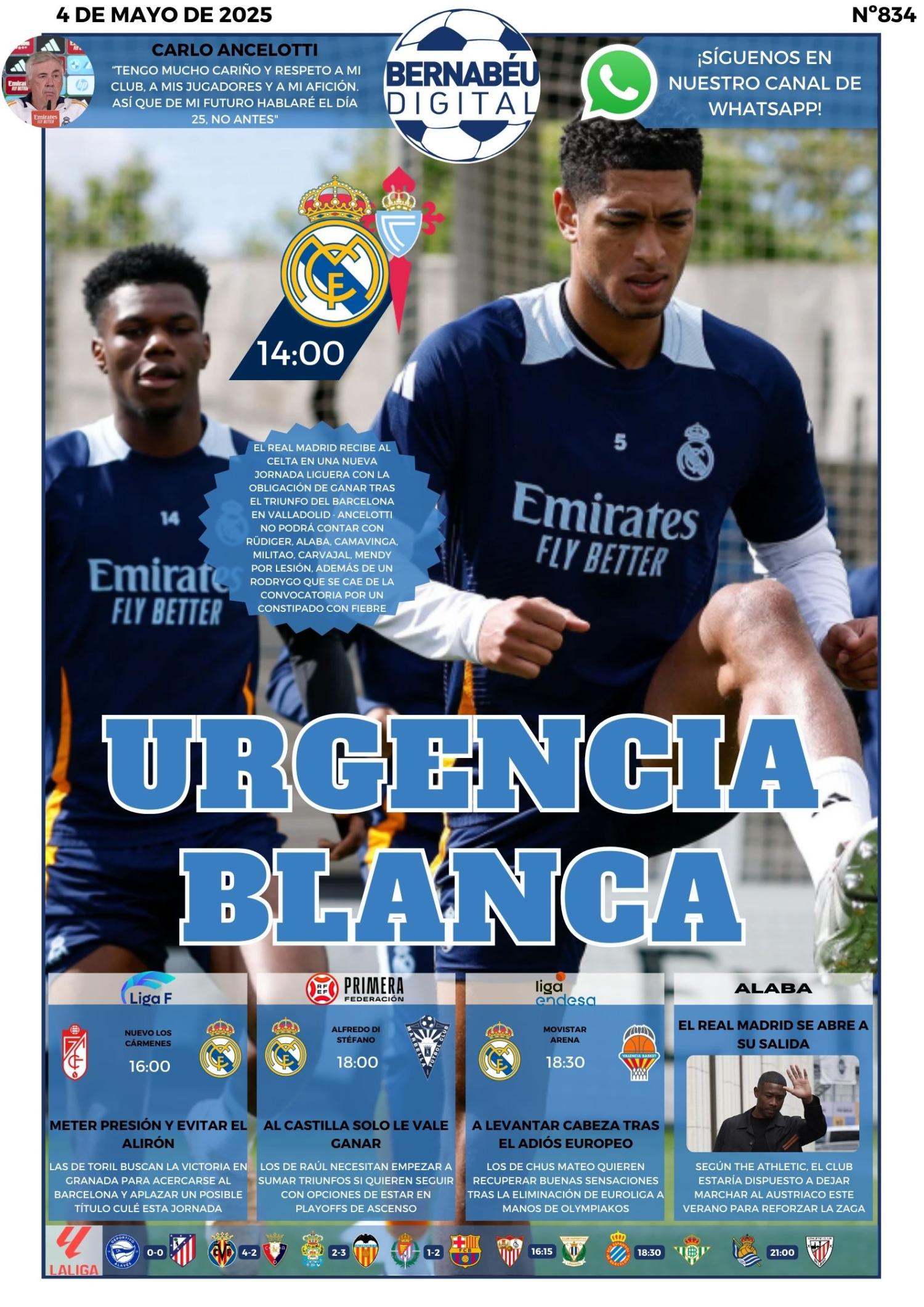 Bernabéu Digital destaca en su portada la previa del partido del mañana entre el Real Madrid y el Celta de Vigo, con una plaga de lesiones, pero con la necesidad vital de vencer para alargar la lucha por LaLiga. También se resaltan las palabras de Ancelotti.