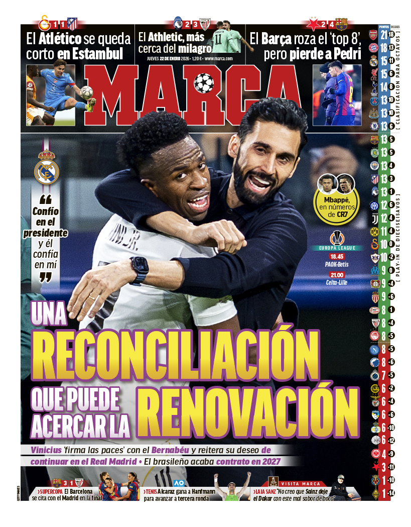En Marca hacen referencia a la renovación de Vinicius y al perdón del brasileño con el Santiago Bernabéu después de dos partidos consecutivos recibiendo las pitadas de la afición blanca. Afirman que quiere seguir y que tiene contrato hasta 2027.