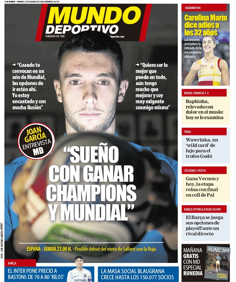El Mundo Deportivo hace hincapié en primera página a Joan García y su convocatoria con la selección, desmarcándose totalmente de la importancia que ha tenido el retiro de Carolina.