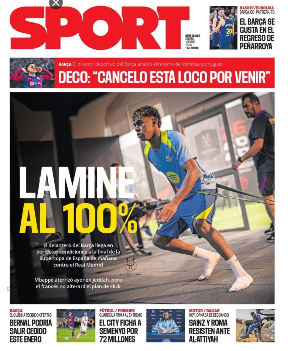Por parte del Sport, destacan en su portada la situación de Lamine Yamal, que busca llegar al 100% para la final de la Supercopa de España contra el Real Madrid, pues el culé es la gran baza en ataque del Barcelona junto a Raphinha.