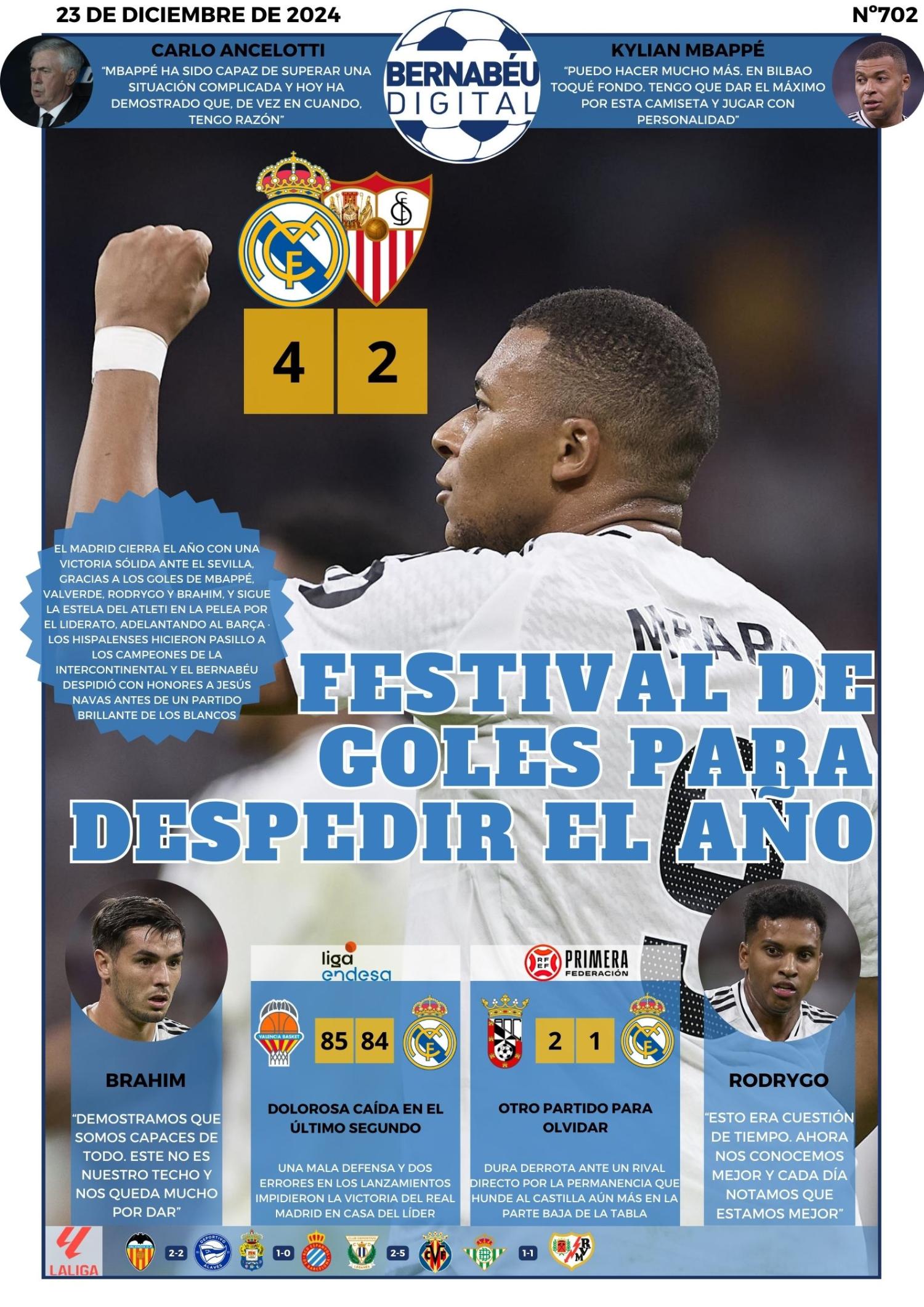 En Bernabéu Digital, hemos decidido abrir nuestra portada del lunes 23 de diciembre con el Real Madrid 4-2 Sevilla. Asimismo, nos hacemos eco de las declaraciones de Carlo Ancelotti, Rodrygo y Kylian Mbappé tras el partido. También destacamos la derrota del Castilla y la del equipo de baloncesto.