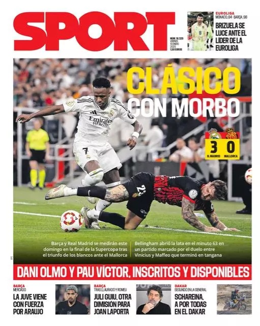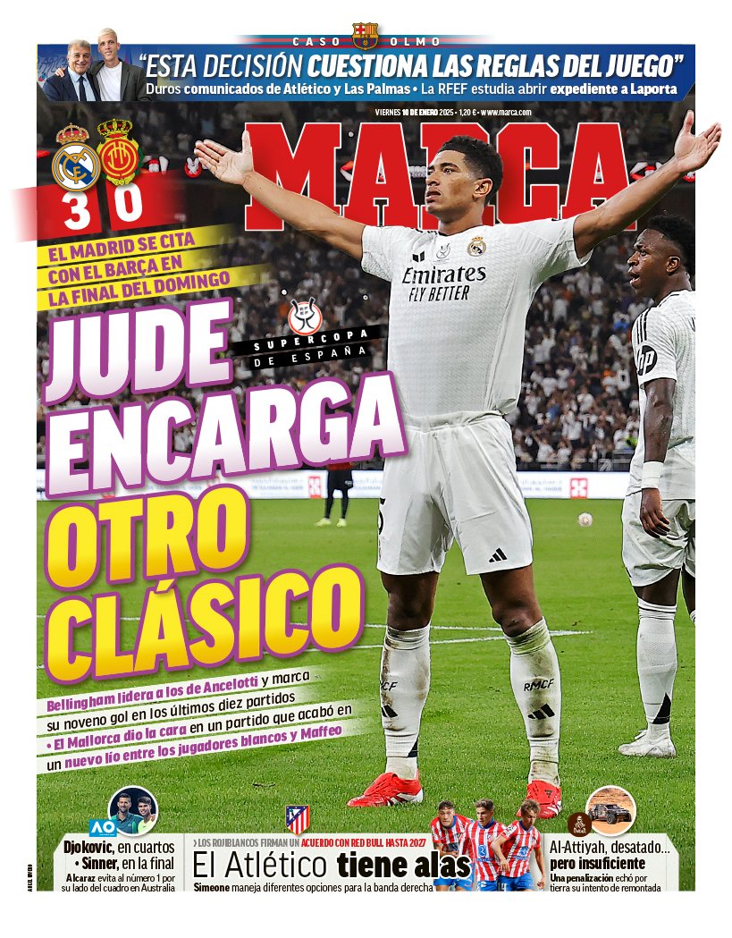 Este viernes 10 de enero de 2025, las portadas deportivas se centran en la victoria del Real Madrid frente al Mallorca en las semifinales de la Supercopa de España.