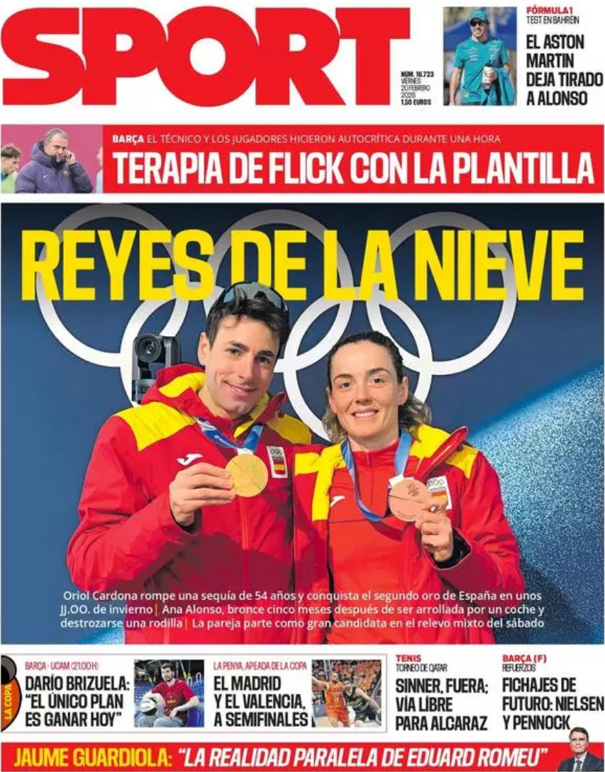 Finalmente, en Barcelona, el diario Sport se rinde a los medallistas españoles bajo el titular "Reyes de la nieve". Mientras se hacen eco del cruce copero de semifinales entre el Real Madrid y el Valencia, en su franja superior desvelan curvas en el rival blanco bajo el título "Terapia de Flick con la plantilla", asegurando que el técnico azulgrana y sus jugadores tuvieron que encerrarse a hacer autocrítica durante una hora.