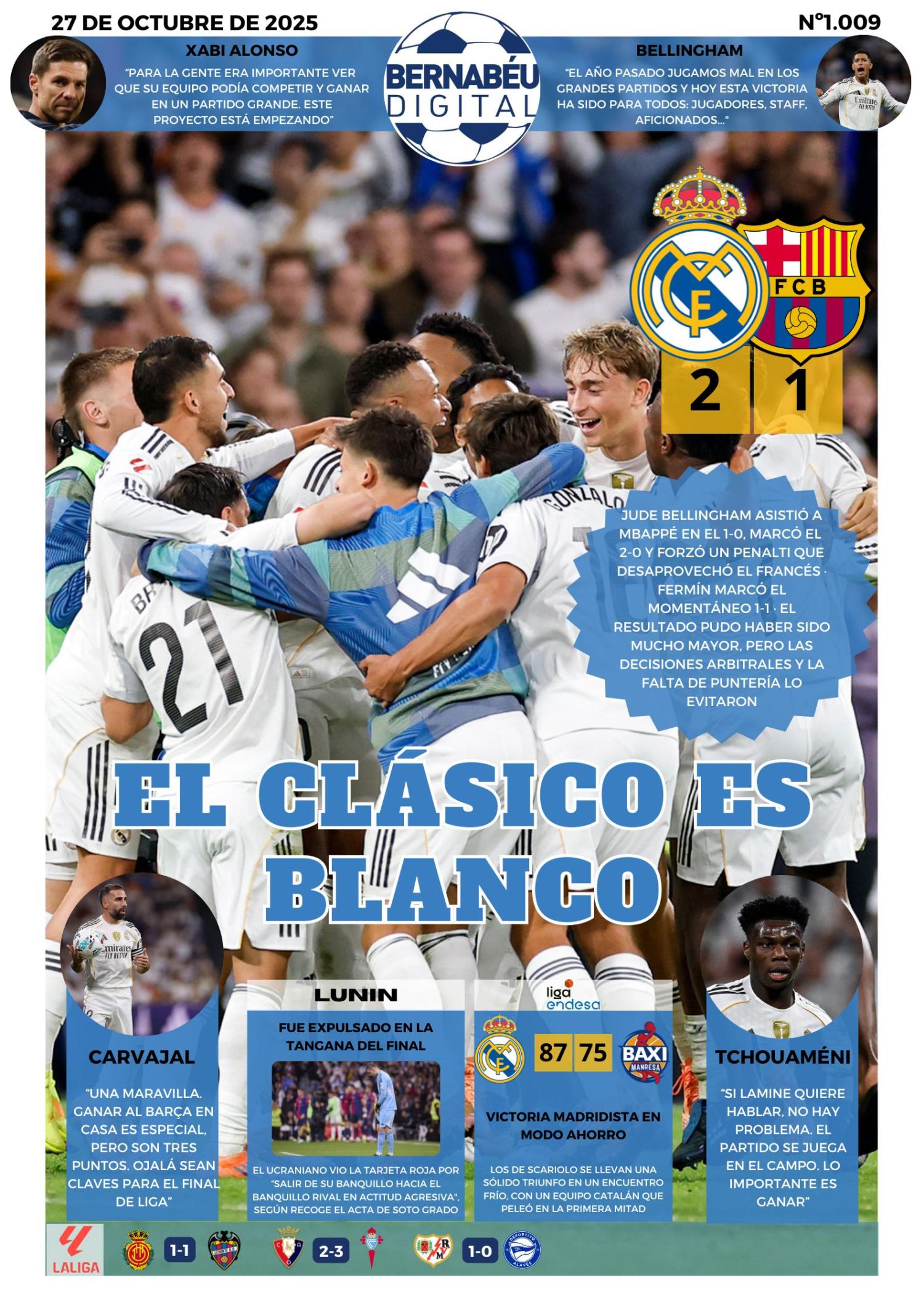 En Bernabéu Digital, hemos decidido abrir portada este lunes 27 de octubre de 2025 con el Real Madrid 2-1 FC Barcelona.