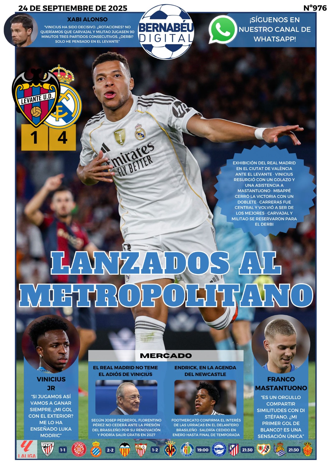 El nuevo triunfo del Real Madrid es el gran protagonista en la portada del miércoles 24 de septiembre de 2025 de Bernabéu Digital. Los de Xabi Alonso encadenan su sexta victoria consecutiva de la temporada en LaLiga, y el séptimo contando el europeo ante el Olympique de Marsella. Kylian Mbappé volvió a rendir de forma estelar.