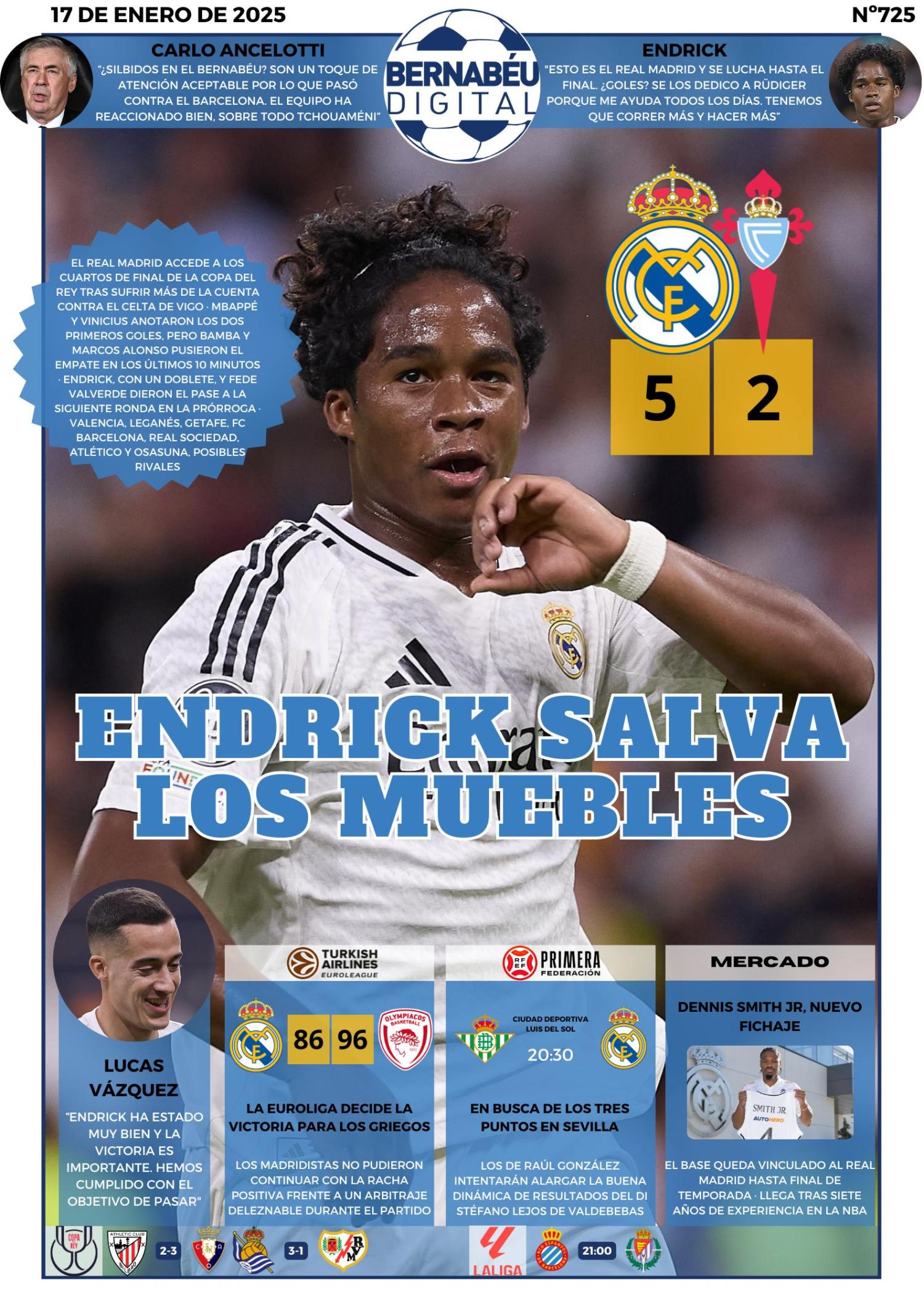 En la portada BD de este viernes destacamos el partido entre el Real Madrid y el Celta de Vigo correspondiente a los cuartos de final de la Copa del Rey.