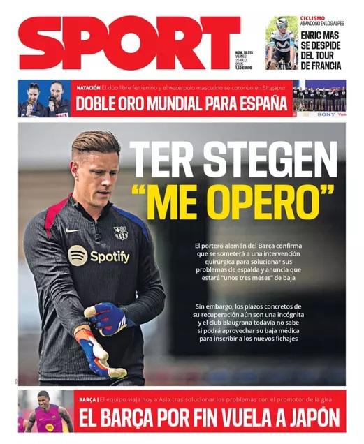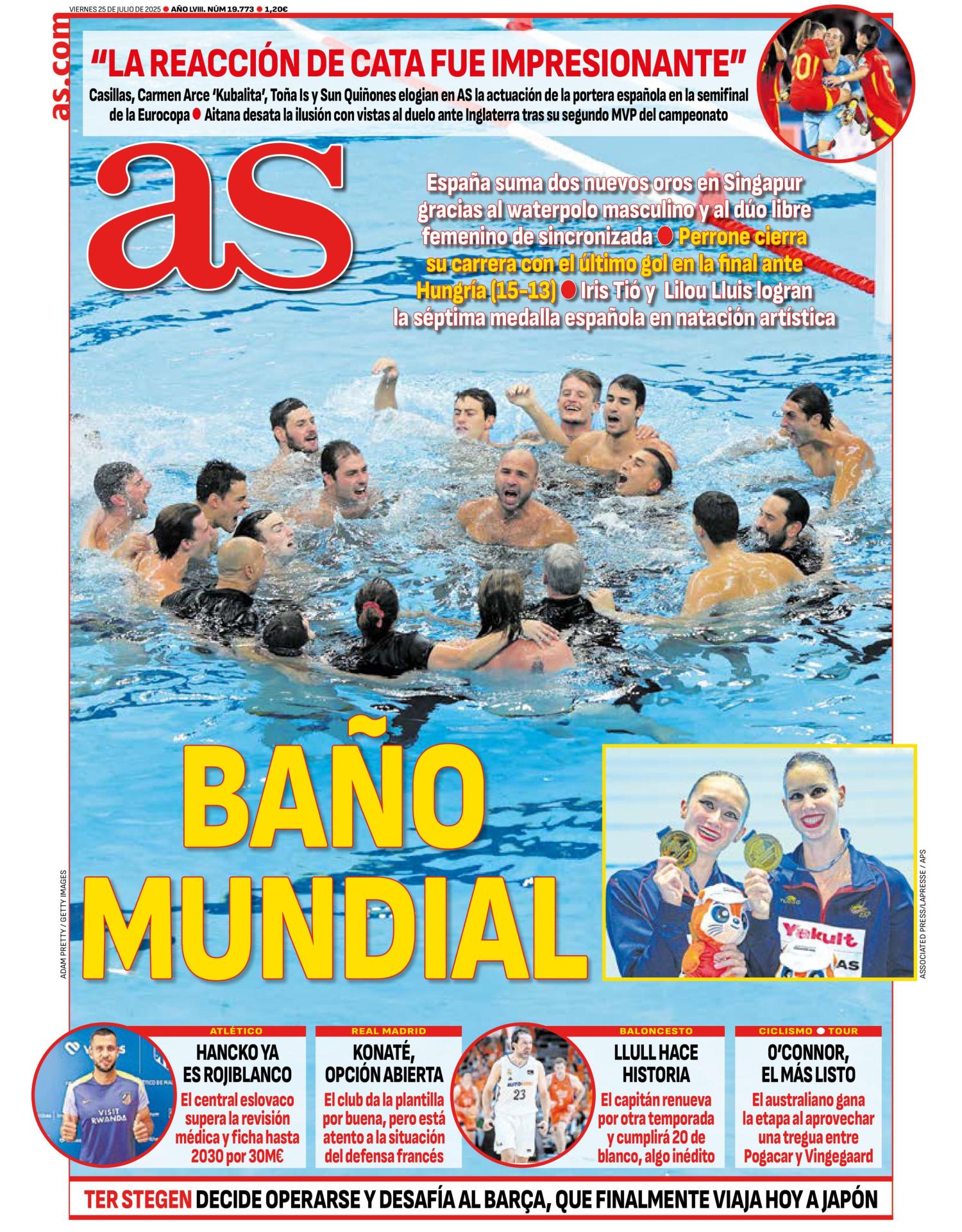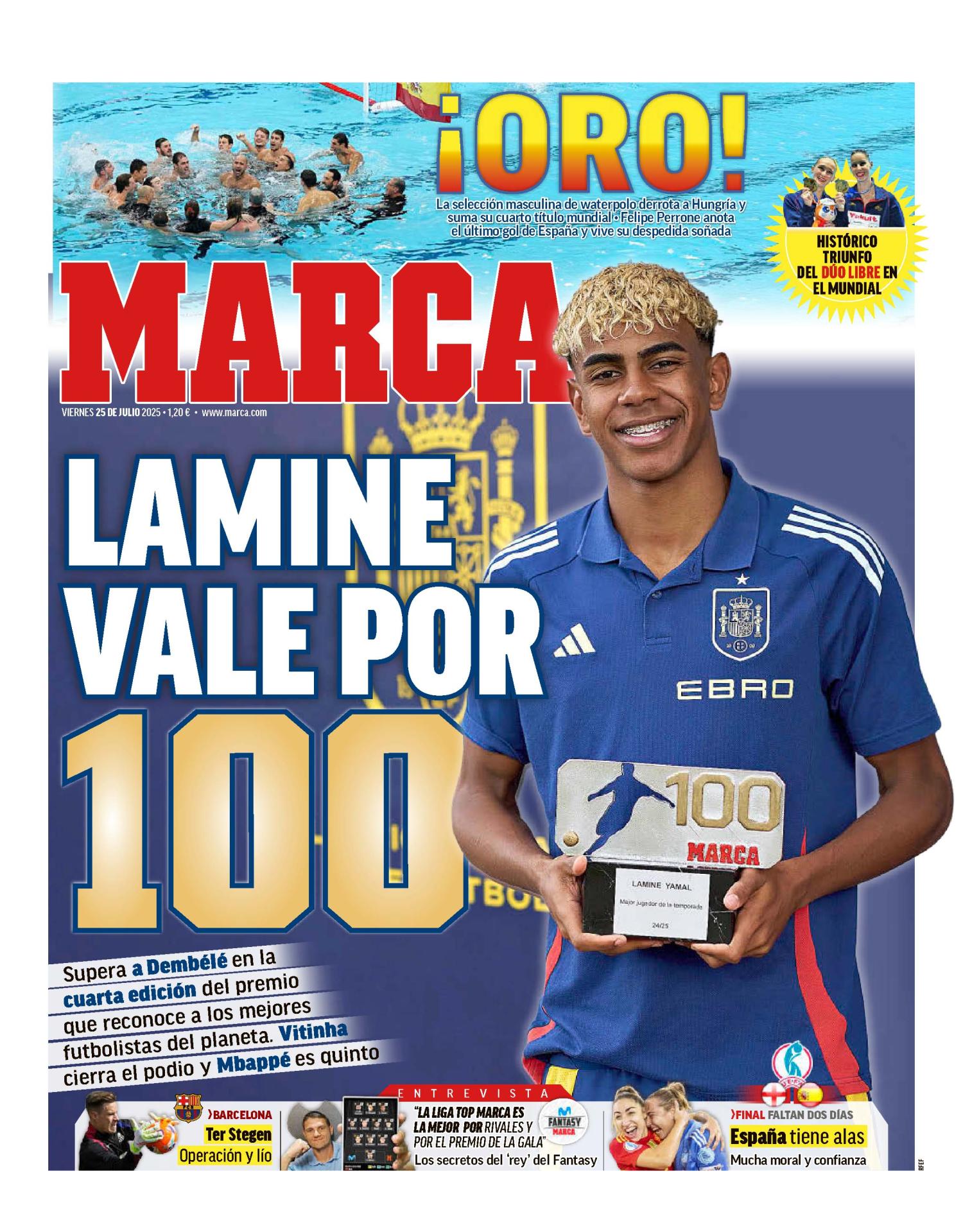 La selección española de waterpolo, Lamine Yamal, Gonzalo y Ter Stegen ocupan las portadas deportivas de este viernes 25 de julio de 2025.