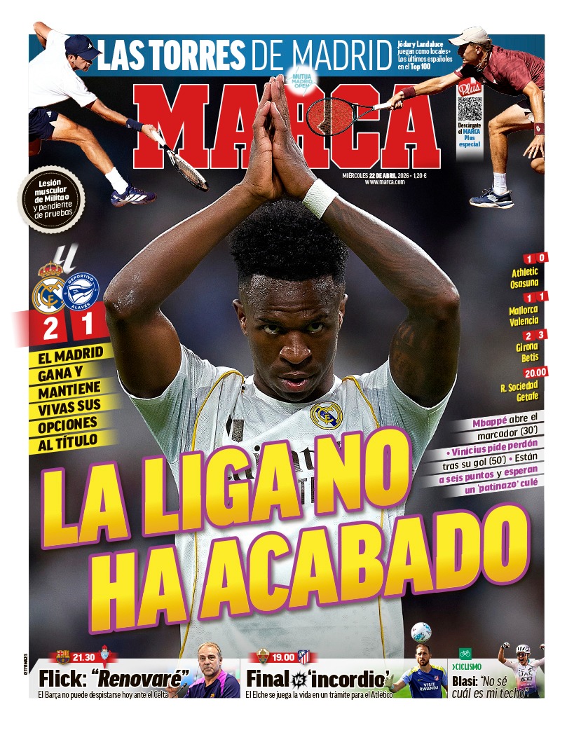 Marca destaca en su portada el hecho de que la liga no ha acabado todavía, y es que la victoria de anoche por la mínima ante el Alavés es suficiente motivo para seguir creyendo la posibilidad de remontar una liga que podría ser histórica.