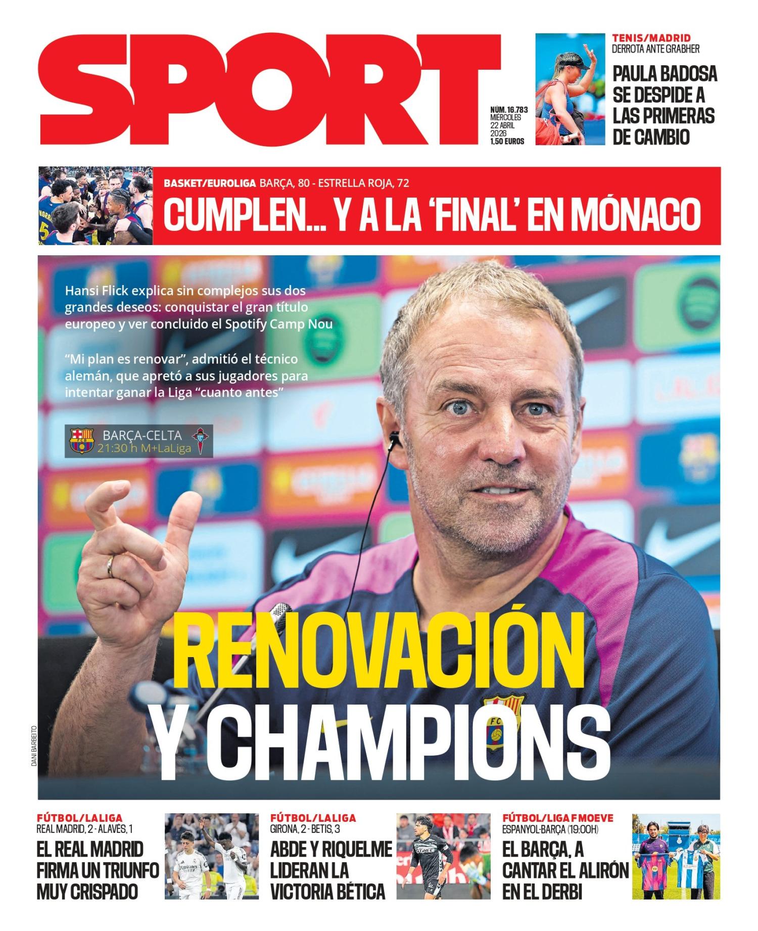 Sport pone como principal protagonista a Hansi Flick, quien podría renovar con el FC Barcelona ya que estaría deseando conseguir levantar la ansiada sexta Champions League para el equipo culé y ya sueña con ella.