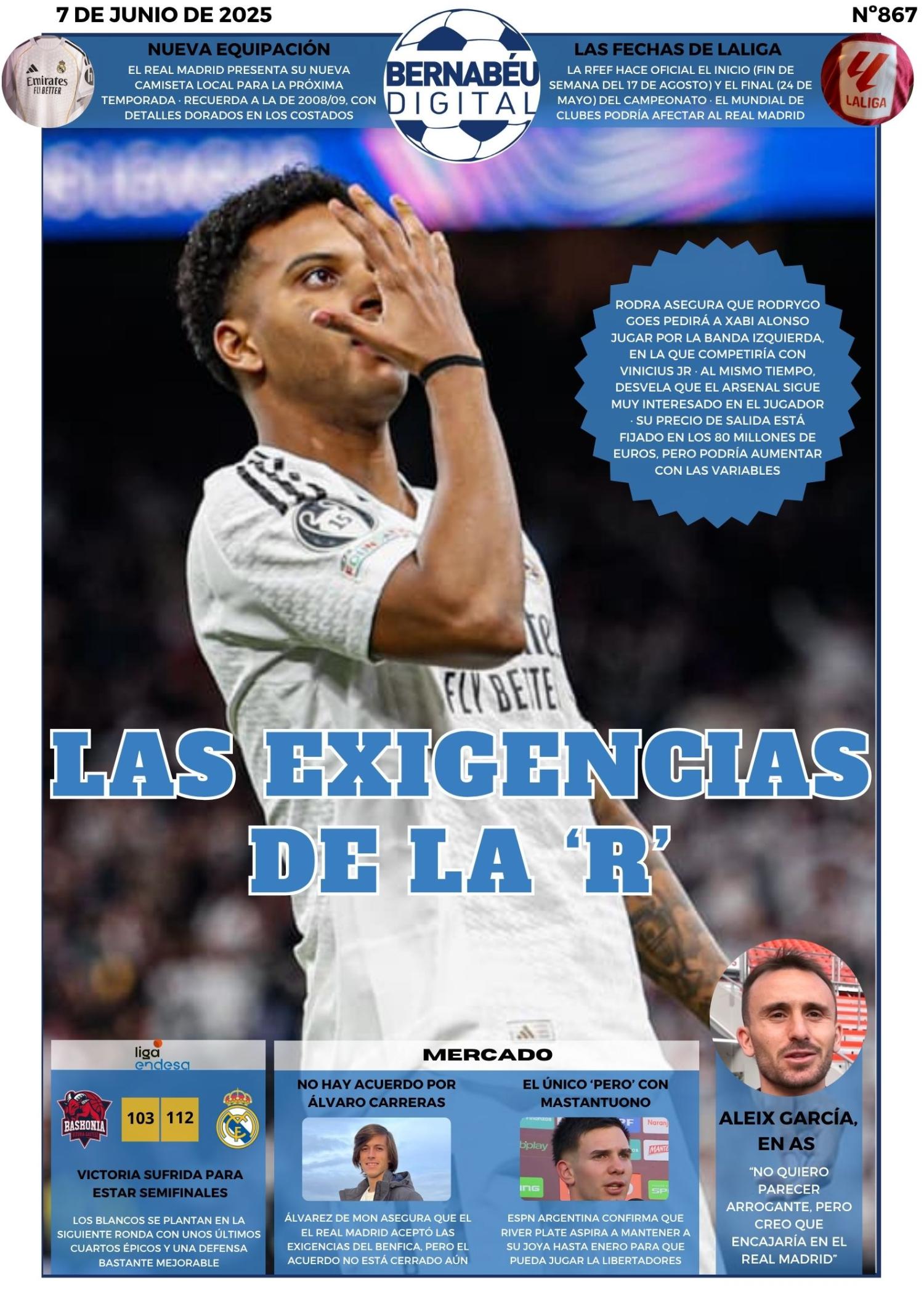 Para este sábado 7 de junio, Bernabéu Digital destaca en su portada las exigencias de Rodrygo Goes para seguir en el Real Madrid. El brasileño querría jugar en la izquierda, costado propiedad de Vinicius Jr.