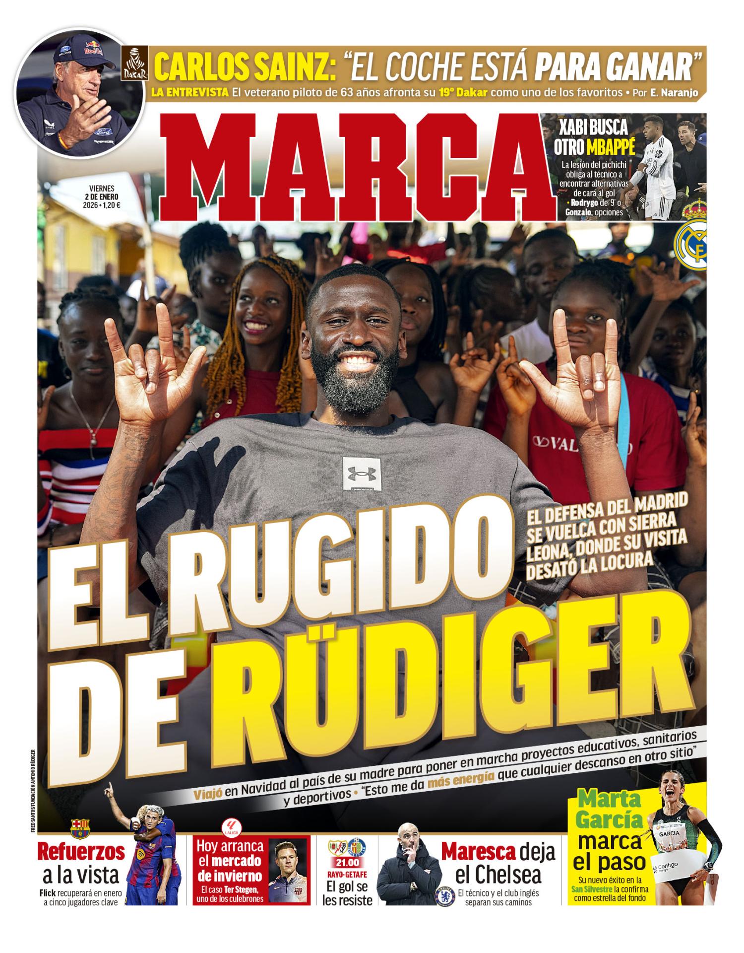 El diario Marca abre su portada con una imagen de Antonio Rüdiger en Sierra Leona. El central del Real Madrid ha viajado al país de su madre para poner en marcha proyectos solidarios. Además, destacan el problema que tendrá Xabi en buscar a otro Mbappé. La lesión del delantero obliga al entrenador a buscar alternativas de cara al gol, como Rodrygo o Gonzalo.