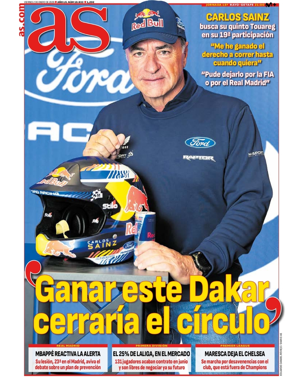 El periódico As dedica su primera página a una entrevista a Carlos Sainz. El piloto menciona que pudo dejarlo "por la FIA o por el Real Madrid". También tratan la lesión del atacante francés. Señalando que esta nueva baja aviva el debate en el club sobre la necesidad de un plan de prevención específico.