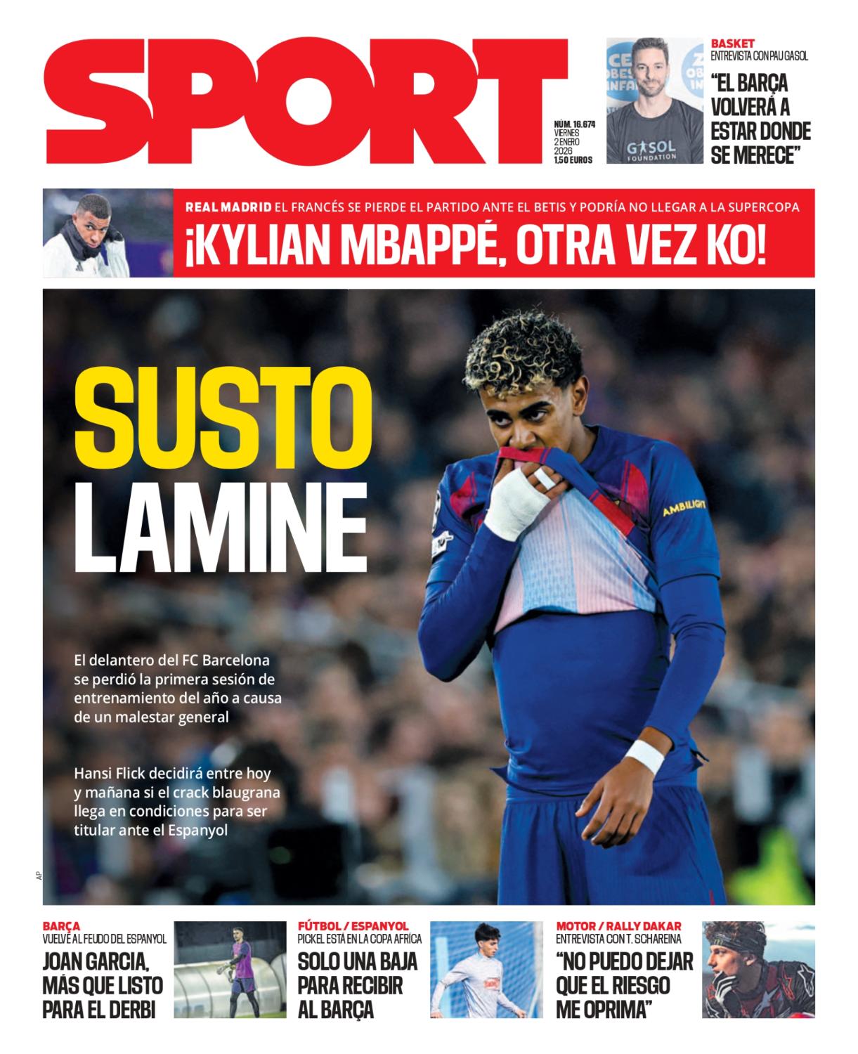 Por último, el diario Sport centra su atención en el Barcelona con "Susto Lamine", indicando que el jugador no entrenó por malestar. Referente al Real Madrid se menciona también la lesión del '10' madridista. El medio catalán resalta que el francés se pierde seguro el partido contra el Betis y que su presencia en la Supercopa está en duda.