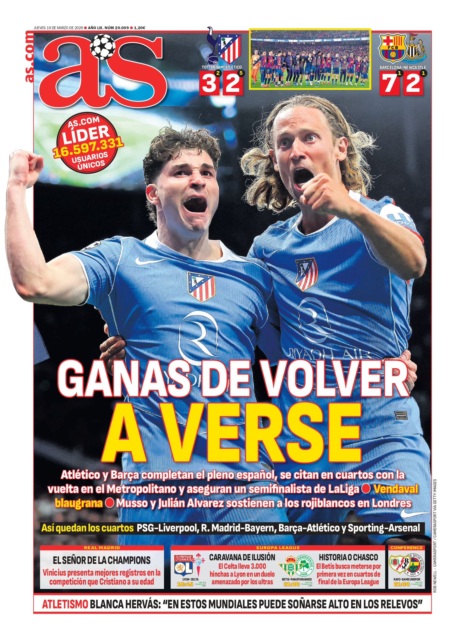 Por parte del AS, el diario saca en primera plana la victoria que ha conseguido el Atlético de Madrid en la pasada noche en su viaje a Londres por la vuelta de los octavos de final de Champions League.