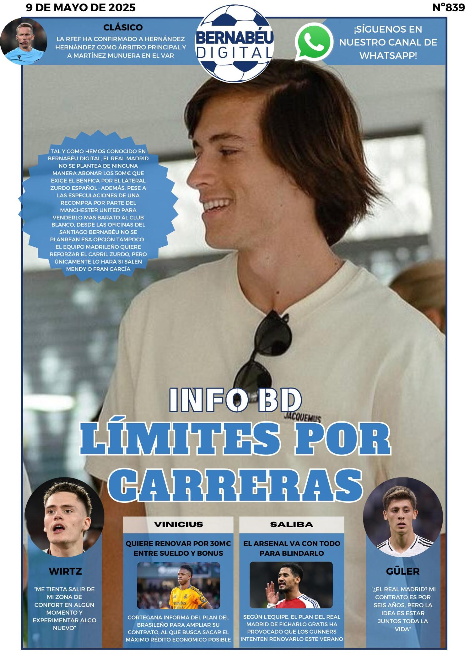 En la portada BD de este viernes destacamos la última INFO BD sobre el posible fichaje de Álvaro Carreras por el Real Madrid. Asimismo, también destacamos la situación con Vinicius y Saliba, además de las palabras de Wirtz y Güler y la designación arbitral del clásico.