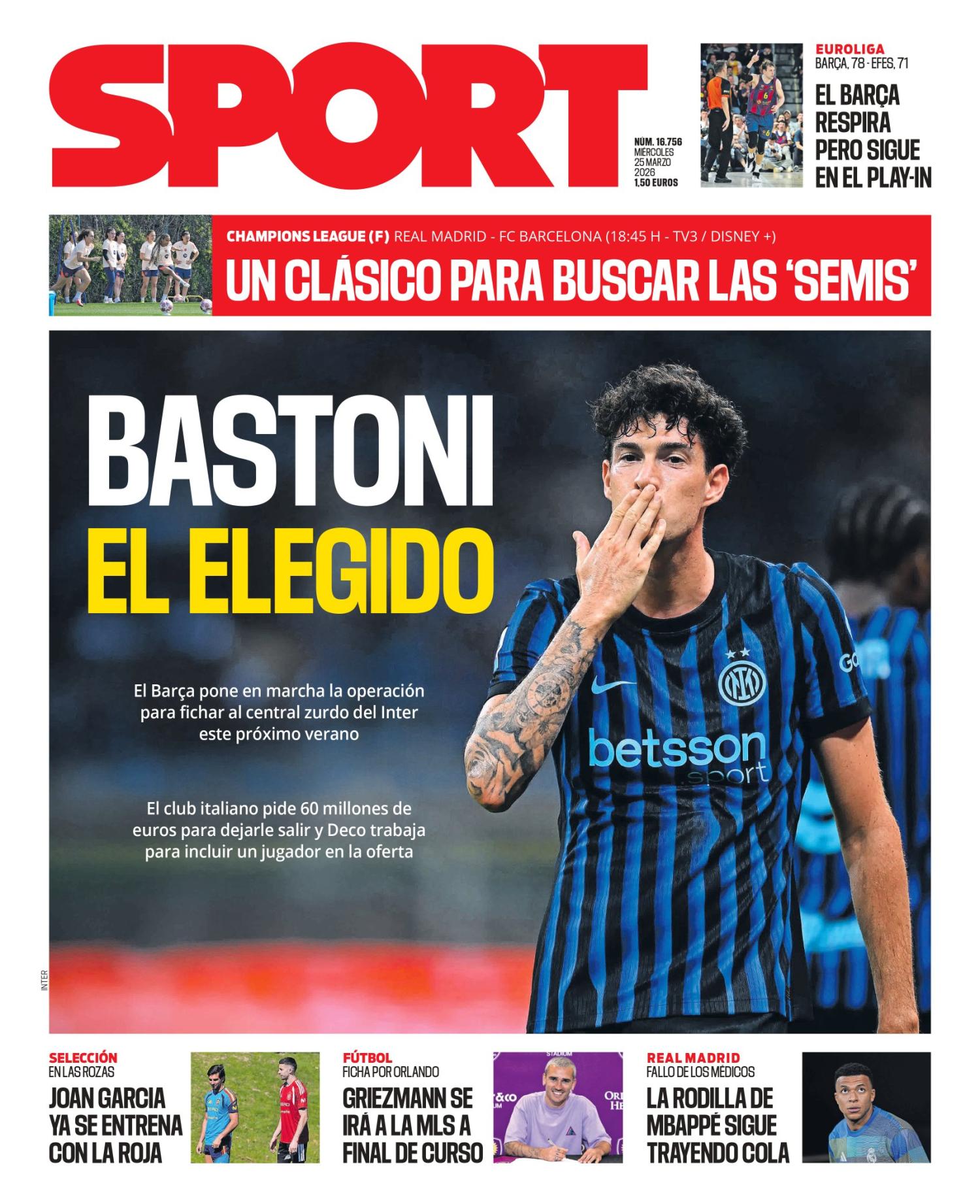 Sport pone como principal protagonista a Bastoni ya que según informa el periódico sería el defensa elegido para reforzar la zaga culé en este mismo mercado de verano.