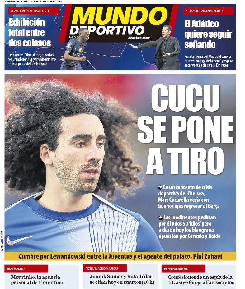 El Mundo Deportivo hace hincapié en primera página a Cucurella, quien afirma este medio deportivo que sería una opción para la defensa del FC Barcelona y podría unirse al club culé este mismo verano.