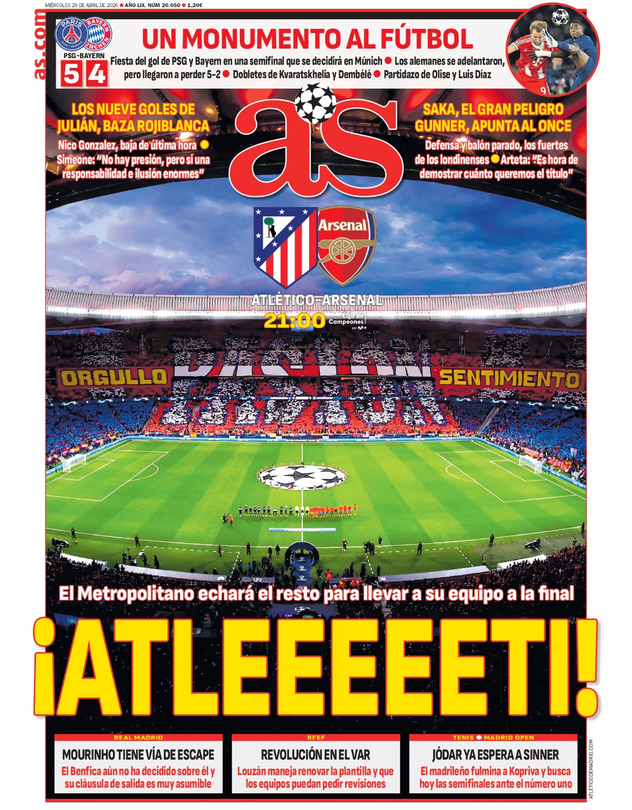 Por parte del AS, el diario saca en primera plana una panorámica del estadio del Atleti vestido con sus mejores galas para recibir con un enorme tifo a sus jugadores, algo que a buen seguro se repetirá esta noche para darles todo el ánimo posible en el partido más importante de la temporada rojiblanca