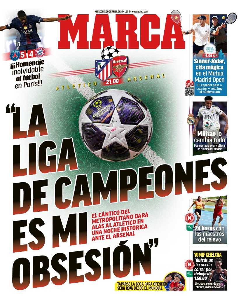 Marca destaca en su portada uno de los cánticos que se escucharán esta noche en el Metropolitano en el partido de ida de semifinales de Champions League que enfrentará al Atlético de Madrid contra el Arsenal.