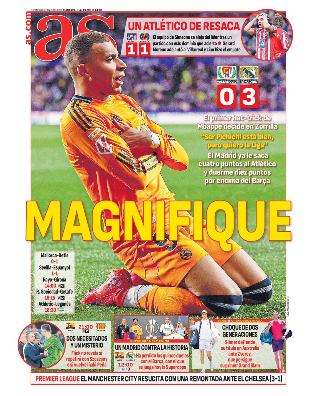 Hoy, domingo 26 de enero de 2025, el diario as saca en portada a Kylian Mbappé, el gran protagonista de la última victoria del Real Madrid ante el Valladolid. "Magnifique", titula.