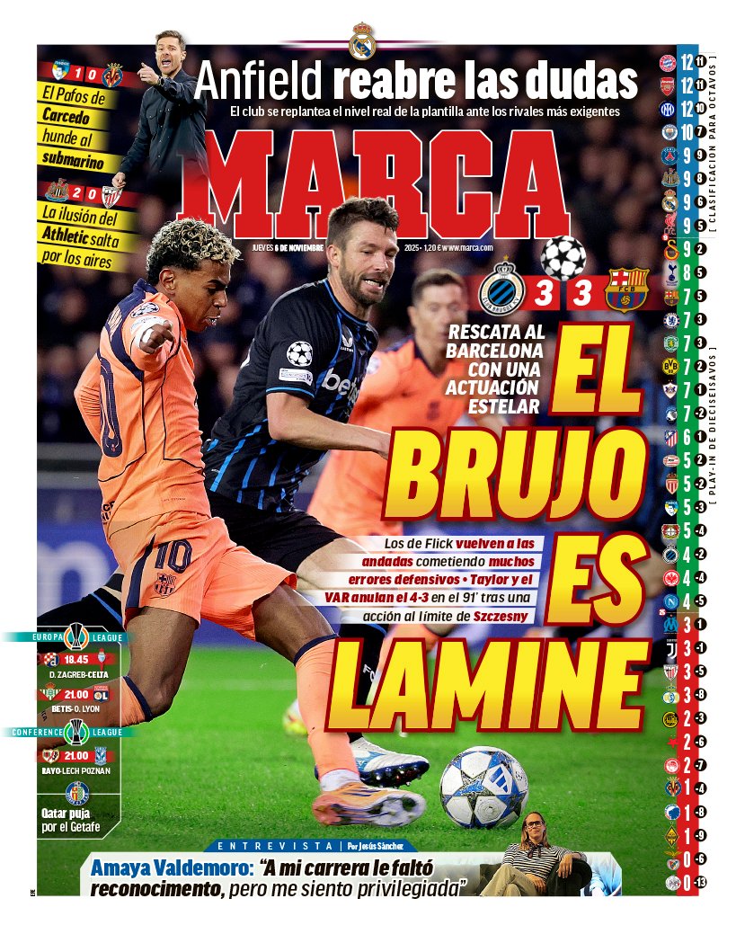 La portada del diario Marca viene protagonizada por el Brujas 3-3 FC Barcelona.